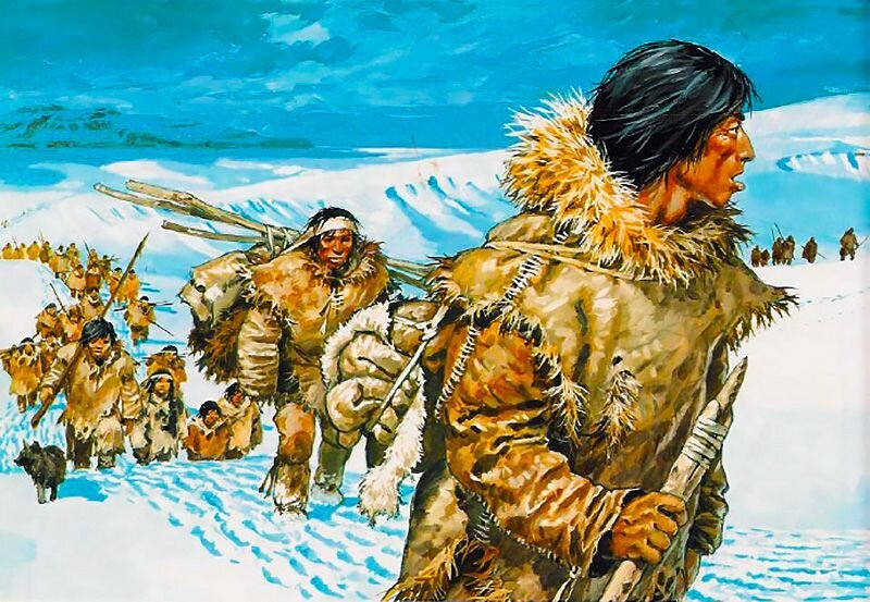 Центральные и северные районы Евразии люди освоили на 20-30 тыс. лет позже. Тут дела шли туго, ледниковый период как бы. После субтропических раёв бороться за выживание приходилось серьёзно. Заселение Америк назначено не позже, чем 13-15 тыс. лет назад. Считается, попали они туда через «Беренгию». Когда большими островками суши пестрели нынешние Чукотское и Берингово моря. Само собой, следов не найти пока, всё скрыто толщей воды после окончания ледникового периода.