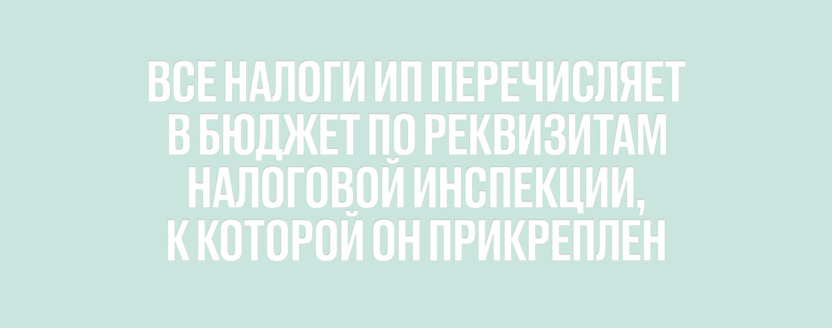 Все налоги ИП перечисляет в бюджет по реквизитам налоговой инспекции, к которой он прикреплен.