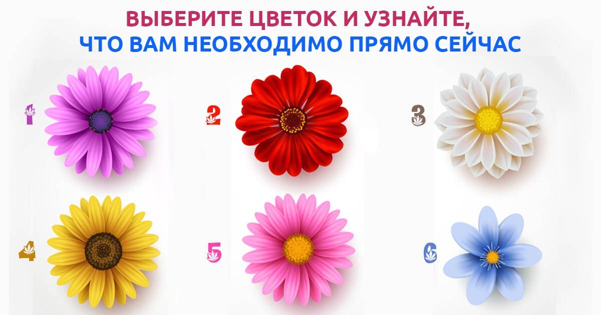 • Какое из изображений вас больше всего привлекает? Найдите по номеру выбранный вами цветок и прочитайте ответ. 1. Вам недостаточно спокойствия. В семье постоянно происходят ссоры, а на работе царит напряжённая атмосфера. Вам сейчас просто необходимо эмоциональный отдых. Иначе у вас начнётся депрессия. 2. Вы нуждаетесь в ласке. Даже если у вас есть рядом близкие, вы всё равно её не получаете! Найдите того человека, который вам сможет по