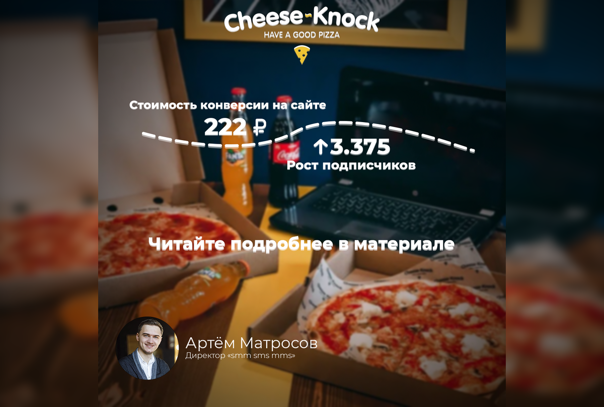 Читать и смотреть - 8,5 минут. Есть в Омске крутая пиццерия CheeseKnock, «Чеснок» с давним собственным тегом #поcheeseknockу . Настоящая итальянская печь, особое внимание к своим блюдам. Владельцы — фанаты своего дела. Работа в Вконтакте и Инстаграм. Можно сказать с долей условности, что пиццерию открыли мой одноклассник и мой одногруппник вместе в 2017 году. Так бывает. БОЛЬШЕ КЕЙСОВ, СТАТЕЙ, ВЫСТУПЛЕНИЙ, СВЯЗАННЫХ СО МНОЙ И МОЕЙ КОМАНДОВ ВЫ ВСЕГДА НАЙДЕТЕ В ГРУППЕ ВК Работа с Чесноком была краткосрочной, но долгосрочной и уместила в себе 3 временных промежутка за 3 года. 1 месяц в 2017, 1 месяц в 2018 и 2 месяца в 2020 годах. Короткое описание с цифрами. Нет времени погружаться в гигабайты воспоминаний, только самое основное. 1 этап - ноябрь-декабрь 2017 Копирайтинг, фото, автоподписки.