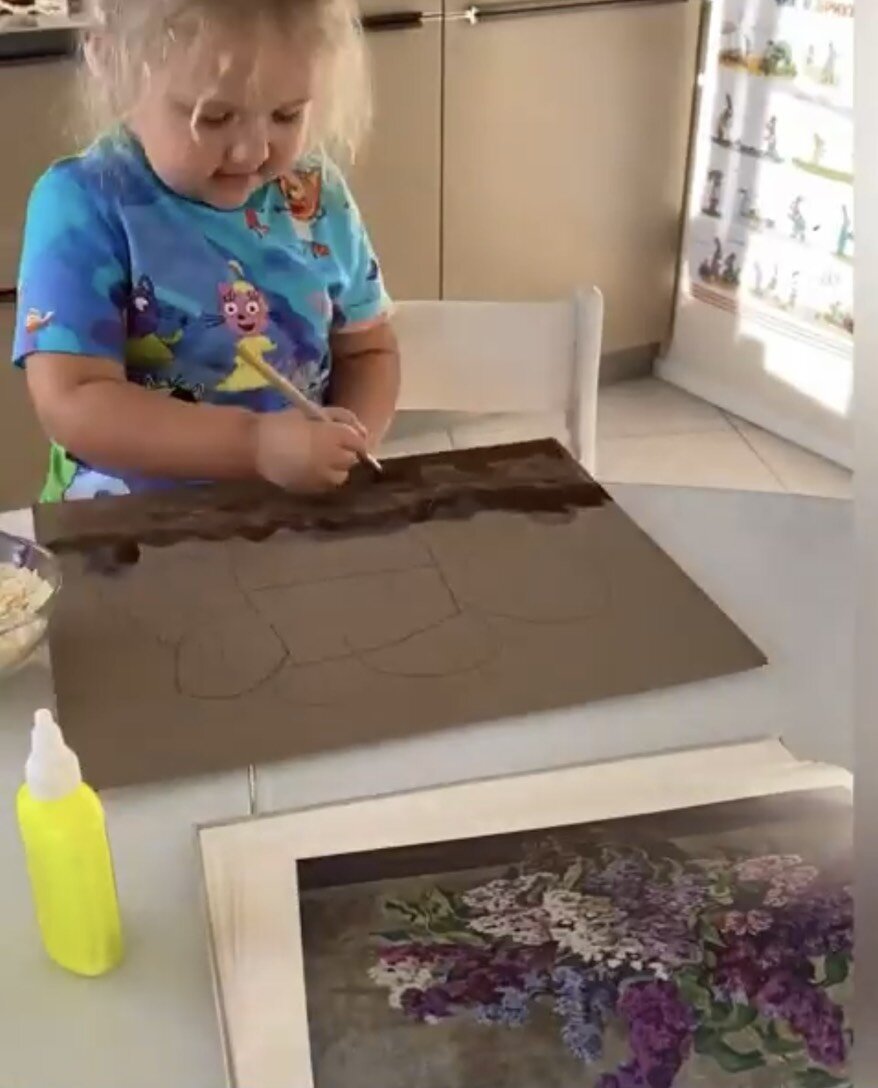 Сирень из хлопьев риса (можно сделать из хлопьев овсянки). Клеем на пва. Старайтесь делать поделку-рисунок вместе. Если у ребенка не получается - не ругайте. Помогате. Эмоции ребенка будут бесценны!