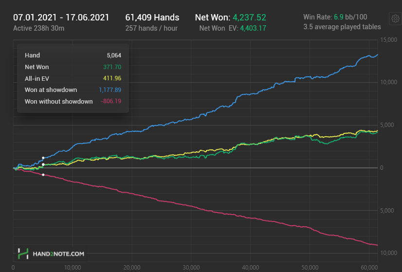 Первым делом, что хочу отметить, я начал тоньше анализировать действия противников, в том числе по размеру ставки. Оказалось что различные ставки тоже дают достаточно информации, чтобы решить как действовать. Этот навык дался после большого количества наигранных рук, со временем уже понимаешь какие ставки что могут означать на микролимитах. А может и не только. Чем больше раздач, тем больше нарабатывается умение чтения оппонента. Как бы в самой игре и тренируешься. Ну и разбор раздач тоже немаловажен. По сессиям. Играл очень мало за май,и по графику сильная просадка, как и в феврале, но менее продолжительная. Если в феврале стрик был около 14 тыс. рук, то в мае всего 10. По целям. Цель в июне отыграть 230 турниров, за половину месяца продвинулся на 25% от плана. Во второй половине следует надавить. По результатам. Так как складывалось не очень хорошо, банкролл сейчас стоит на месте.
