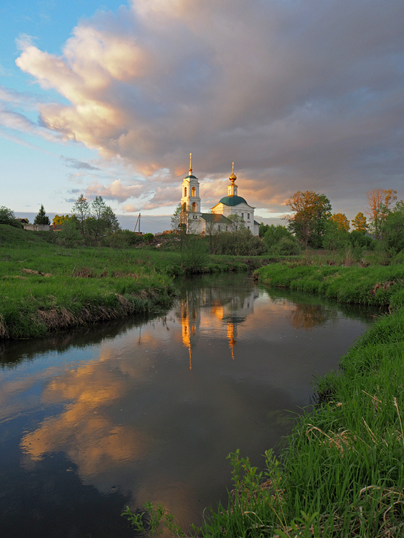 Есть одно симпатичное местечко, где хорошо снимать закат с отражением. Это село Сидоровское на реке Молохта. Оно примечательно тем, что в селе когда-то стояла деревянная церковь Николая Чудотворца. В середине XVII века священником этого храма был отец Михаил – будущий святитель Митрофан Воронежский, сподвижник Петра I. А в конце XVII века на месте старой деревянной была построена кирпичная церковь Иоанна Предтечи с пределом Николая Чудотворца. Вот её я и собирался фотографировать.