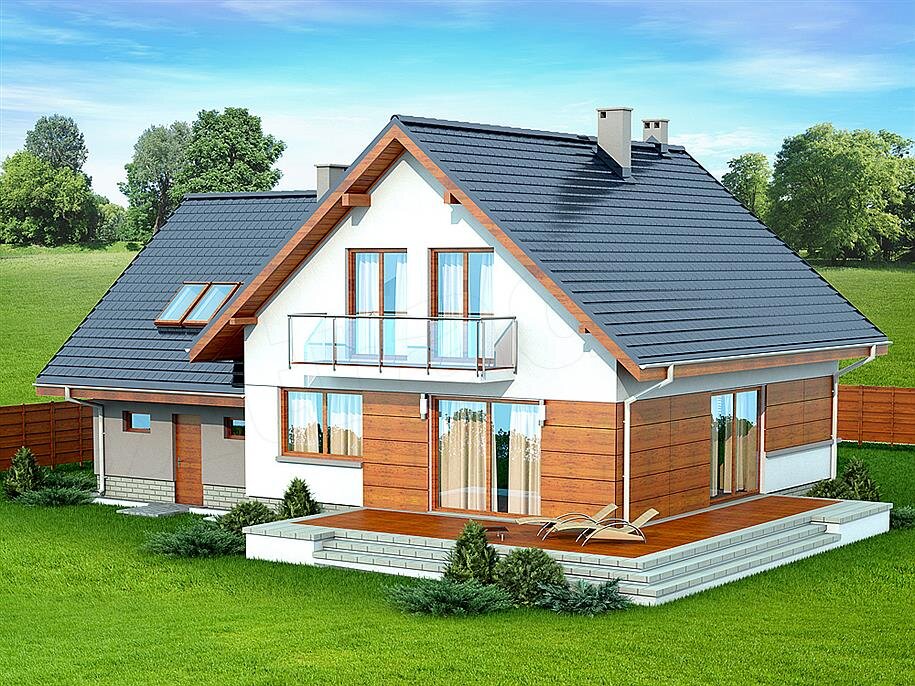 Познакомьтесь с оригинальным проектом «Беркут» дом в стиле модерн. Этот коттедж прекрасно подойдет для семьи из 6ти человек. Он состоит из 5ти комнат, площадь дома 195 м2, один этаж + мансарда. Большая веранда, которая отлично подойдет для детских игр. 📉 Характеристики: Дом может быть построен из различных материалов, на ваш выбор: арболит, SIP- панели, кирпич, газоблоки, клееный брус, профилированный брус, каркасный. Фундамент: Свайно ростверковый, монолитная лента, монолитная плита. Несущие стены: керамические блоки, блоки из газобетона, блоки из арболита, брус профилированный, брус клееный, SIP- панели, каркасный. Облицовка фасада: облицовочный кирпич, штукатурка декоративная, металлический сайдинг. Кровля: металлочерепица, мягкая черепица (битумная), композитная черепица. Планировка 1 этажа: Ознакомимся с планировкой этого необычного проекта. На первом этаже находится просторная гостиная с обеденной зоной, рядом с гостиной расположена кухня, ещё на первом этаже разместилась гостев