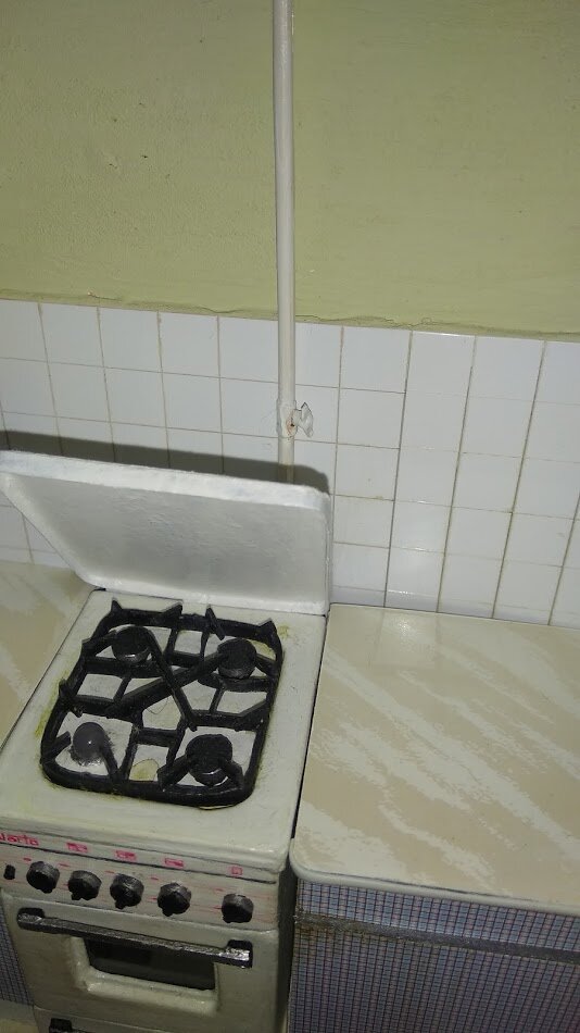 Очень часто приходится делать мелкие детали, которые в итоговом варианте практически не видны, но не сделать их не могу, потому что именно такие мелочи создают ту атмосферу реалистичности, которая дает ощущение настоящей квартиры при взгляде на фото. Например, вчера сделала газовую трубу за плитой и кран на ней. Если трубу будет видно, то кран будет полностью закрыт крышкой от плиты. Но не сделать его не могла, без него совсем не тот вид. По идее там должно быть еще ответвление трубы, но его уже не стала делать. А, может, еще и сделаю... Вот так будет выглядеть в итоговом варианте, крана не видно совсем. Но он есть :) И это главное. Вчера в Инстаграме в комментариях один миниатюрист сказал, что у него в одной из работ есть полностью обставленная комната, которую не видно. Комната! Целая! Вот это я понимаю размах! Также вчера сделала плинтуса и небольшую тумбу в угол. Тумбу, скорее всего, еще изрядно запачкаю, слишком чистая она пока. Предыдущие "серии" про домик есть здесь, или здесь,