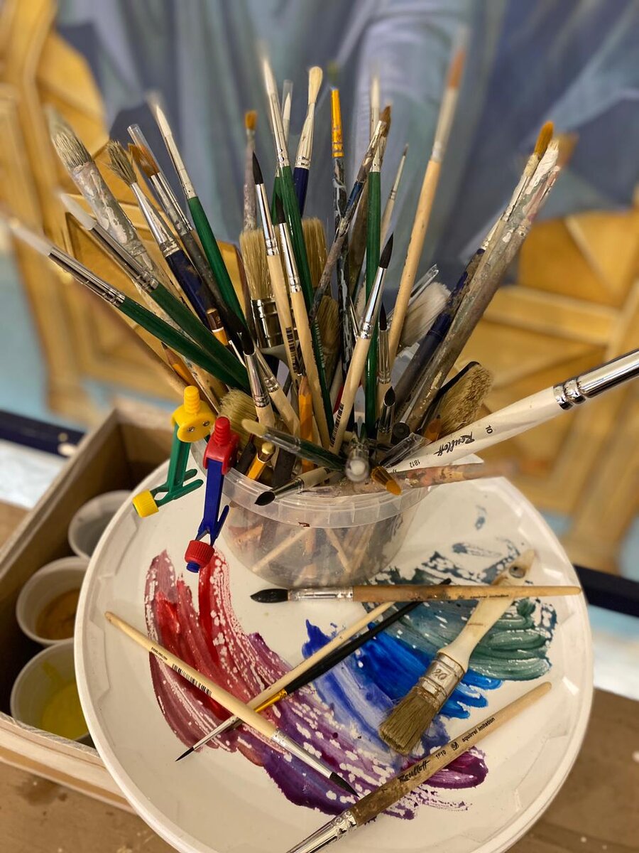 Живописные кисти. С какими Вы работаете? - Спрашиваете Вы в сторис. Отвечает иконописец мастерской, Иван Тимофеев (расписывает храмы): Выбор кистей зависит от поставленной задачи и темперамента художника. Лично я работаю следующими видами кистей: К примеру, поначалу я беру какую-нибудь списанную щетину, от которой практически уже ничего не осталось, но зато она очень жёсткая и хорошо держит тонкую линию. И как карандашом пишу силуэт. Затем беру флейц и начинаю раскрывать рисунок в цвете, находить тональность разными лессировками. Когда есть силуэт и образ раскрыт в цвете, чтобы фигура начала обретать более ясные черты, начинаю выводить тонкими мягкими кистями. Кисти из беличьего волоса идеальны для финальных стадий, тонких прописей. И в завершение использую синтетические кисти. У нас в бригаде есть иконописцы, которые работают исключительно щетиной, либо чисто синтетикой. Кисти, как и краски, – всего лишь инструмент в руке иконописца, которой водит сам Господь.