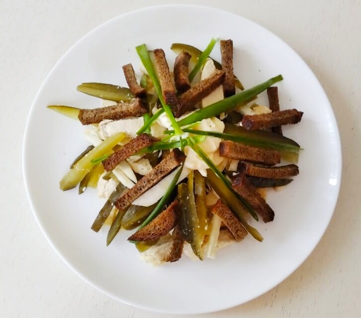 Готовое филе и соленые огурцы (125 гр.) нарезаю соломкой. Ко рень сельдерея (125 гр.) очищаю от кожуры и нарезаю его тонкой соломкой. Нарезанный сельдерей выкладываю на дуршлаг и опускаю его в кипящую подсоленную воду на 4 минуты. Черный хлеб (150 гр.) нарезаю на небольшие брусочки и обжариваю их на раскаленной сковороде с 10 мл. растительного масла до румяного оттенка. Куриное филе, соленые огурцы и сельдерей выкладываю на тарелку и добавляю к ним 30 мл. майонеза. Сухари кладу в отдельную тарелку. Непосредственно перед подачей, салат перемешиваю и добавляю к нему сухари.