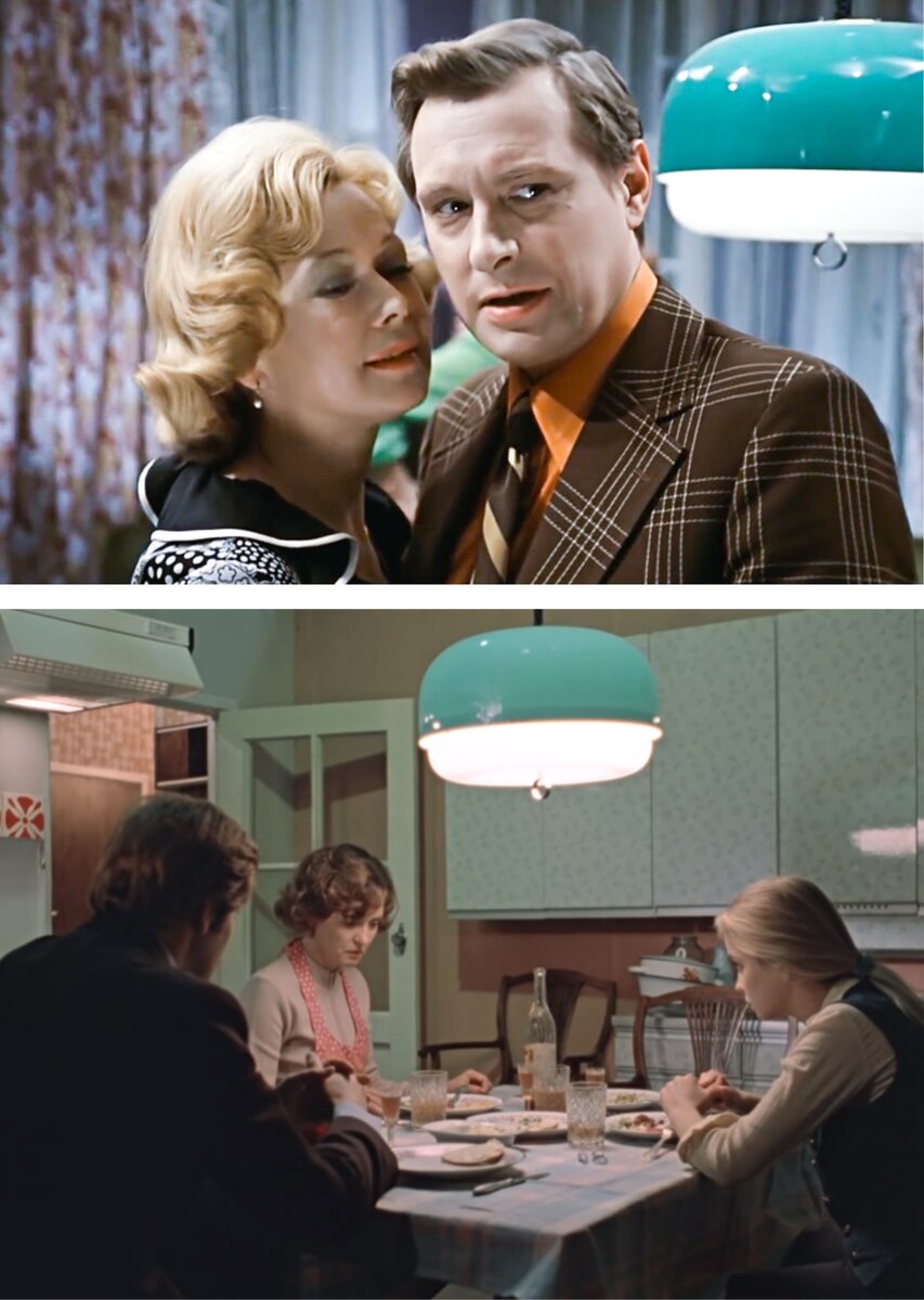 В прошлом материале мы постарались собрать самые известные реквизиты (одни и те же), попадающиеся в разных советских фильмах. В комментариях наши читатели поддержали и даже дополнили тему. Лампа Ранее мы выяснили, что эта типичная советская пластмассовая лампа мелькает в "Служебном романе" и "Москва слезам не верит". Оказывается, она же присутствует в "Ночь над Чили" (1977): Плед В "Москва слезам не верит" полосатый плед на стене в квартире персонажа Табакова необъяснимым образом перемещается на пикник с Гошей. Этот же плед можно заметить в комедии "Одиноким предоставляется общежитие" (1983): Ковер Своя жизнь в "Москва слезам не верит" и у ковра. Изначально он "проживает" у профессора Тихомирова, а спустя 20 лет — на квартире у Катерины. При чём, за столько лет не потерял лоска. Камзол В фильме "Собака на сене" у героя Караченцева тот же камзол, что и у Атоса в "Трёх мушкетёрах". Платья Одинаковое платье у Раисы Захаровны в сцене на рынке ("Любовь и голуби") и у героини Галины Петрово