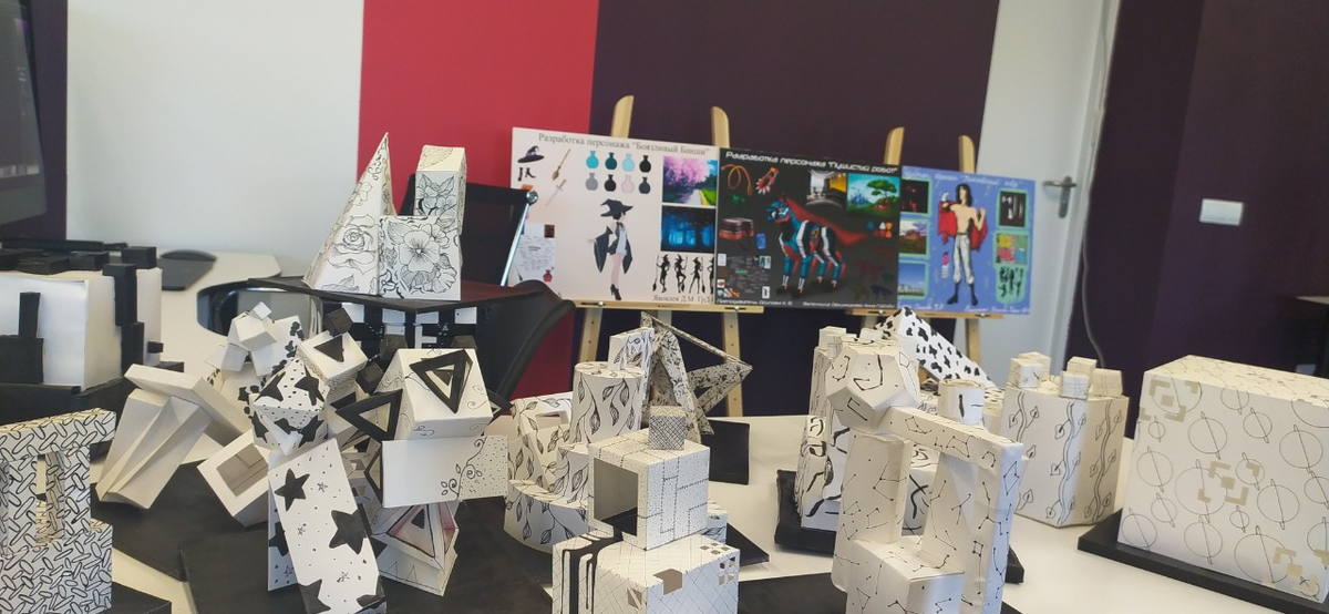 Преподавателями графического дизайна Смазновой Анастасией Александровной и Осиповой Ксенией Владимировной была организована выставка работ студентов. На дисциплине "Основы материаловедения" первокурсники создавали объемный макет с имитацией ткани. Ватман, черная гелевая ручка, черная краска, клей и фантазия - всё, что нужно, для создания уникальной геометрической фигуры. В рамках аудиторных занятий будущие дизайнеры первого и второго курса разрабатывали персонажа. Им было предложено вытянуть две бумажки: одна с существительным, другая - с прилагательным. Отталкиваясь от полученного персонажа студентам нужно было составить сетку ассоциаций, отрисовать атрибуты и среду обитания, а также используемую палитру цветов. И, конечно, отрисовать сам образ получившегося существа. Работа выполнялась на компьютере с помощью графического планшета. Своё творение студентам нужно было распечатать в формате А3 и приклеить на картонный планшет. Сейчас у студентов-второкурсников проходит учебная практика,