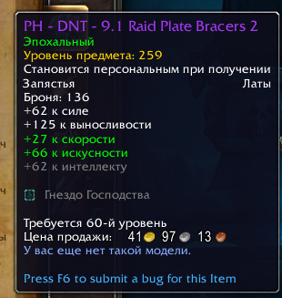 - Ominous Shard of Dyz – При нанесении урона цели вы повышаете наносимый ей от вас урон на 0,37% на 4 сек., суммируется до 3 раз.