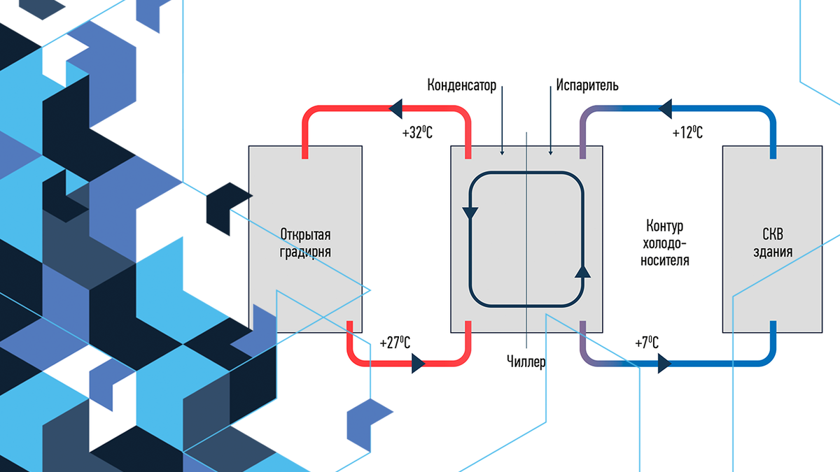 Наиболее распространенным типом оборудования для обеспечения средней и большой холодопроизводительности считаются открытые градирни. Они оказываются привлекательными благодаря широкому диапазону мощностей и конфигураций, хорошей энергоэффективности и разумными капитальными затратами. Однако, у открытых систем оборотного водоснабжения имеются недостатки по сравнению с вариантом закрытого контура охлаждения. Наиболее существенными недостатками систем с открытыми градирнями можно назвать повышенное потребление воды и необходимость её очистки, что связано с требованиями к техническому обслуживанию. В качестве примера можно рассмотреть варианты градирен для водяного охлаждения конденсаторов чиллера. Открытая градирня даже в жаркие дни может охладить воду до +27 °С при температуре наружного воздуха +30 °С и относительной влажности 50%.