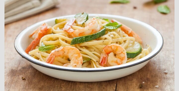 быстрым. Получается свежее и нежное блюдо. Подходит для вечера с друзьями или, почему бы и нет, для ужина на двоих . Ингредиенты: 400 г лингвини 24 креветочных хвоста 2 кабачка 20 г сливочного масла 1 рюмка бренди 1 зубчик чеснока оливковое масло первого отжима соль перец перец чили по вкусу Как приготовить пасту с креветками и кабачками Чтобы приготовить пасту с креветками и кабачками, очистите два кабачка, разрежьте их пополам вдоль, а затем на косые дольки. Держите их в стороне. В кастрюле нагрейте сливочное масло и немного растительного масла и очень быстро пожарьте креветки, уже очищенные и выгравированные сзади. Деглазуруйте бренди, дайте ему испариться и переложите на тарелку. В тот же соус для приготовления добавить чеснок и поджарить его вместе с кабачками в течение нескольких минут. Посолить, поперчить и добавить чили по вкусу. Отварите лингвини, слейте воду и переложите в сковороду с кабачками. Добавьте креветки и