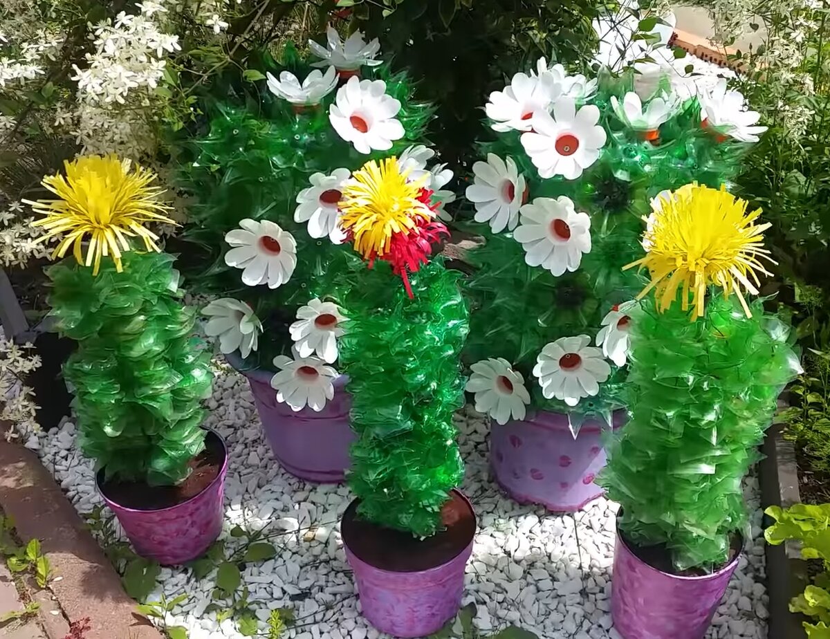 Сегодня я расскажу вам, как можно вырастить кактусы из... пластиковых бутылок! Такие кактусы не нужно поливать, они всегда будут радовать вас своим внешним видом и, возможно даже, цветением, они никогда не завянут и они совсем не колючие! Заинтересовала? Тогда приглашаю на мастер класс. =) Нам понадобится: 1. 2х литровая зелёная бутылка. 2. Проволока. 3. Гипс или алебастр. 4. Маленький горшочек или ёмкость, куда мы посадим кактус. 5. 1 столовая ложка чёрного чая. 6. Ножницы. 7. Плоскогубцы. 8. Свеча. Итак, начнём. Разрезаем нашу бутылку вдоль и режем её на полосы высотой 1-1,5 см. Режем получившиеся полоски на квадратики. Квадратики получаются размером примерно 1,5 на 1,5 см. Сразу раскладываем квадратики кучками примерно по 70 шт. Должно получиться с одной бутылки 7 кучек. Вот, что осталось у меня от бутылки =) Нарезаем 7 штук проволоки длиной примерно 20 см. И нанизываем квадратики на проволоку (на 1 проволоку нанизываем 1 кучку квадратиков, то есть 70 штук). Держим один край провол