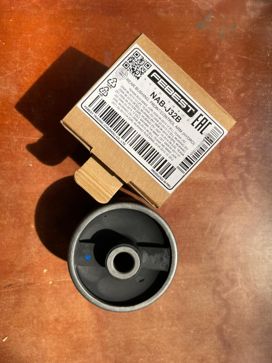 На моем авто установлены как раз такие гидравлические сайлентблоки. Когда резина сайлентблока изнашивается, жидкость из полостей начинает просачиваться наружу, запчасть пора менять. Так вот такая поломка ― это тот случай, когда весь рычаг сразу менять необязательно. Во-первых, это очень дорого, особенно если автовладелец хочет поставить оригинальную запчасть. Можно сохранить оригинальный рычаг, но поставить сайлентблок другого производителя. Такой вариант лично мне ближе. Буквально месяц назад покупал бюджетный гидравлический сайлентблок Febest(NAB-J32B, задний сайлентблок переднего рычага), он обошелся мне в 1200 рублей.