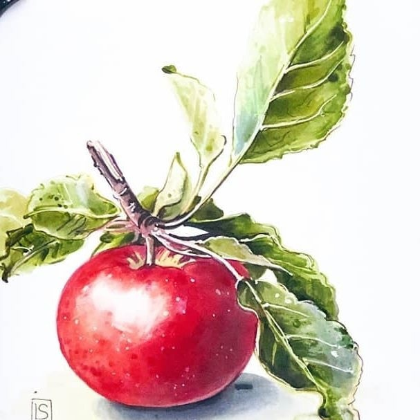 Сначала нарисуем яблоко, а в конце статьи я дам вам ссылку на бюджетные маркеры. Они рисуют так же как бредновые, но стоят в 10 раз дешевле. Бренд из 12 базовых цветов можно купить по цене около 2 тысяч. Но рисуя маркерами, художнику требуются множество дополнительных оттенков. И вы это заметите на фото, где вместе с рисунком показана выкраска нужных цветов. Лично я не пользуюсь брендами, а покупаю обычные маркеры на JOOM. Там за эти же деньги можно купить набор цветов 100 штук!!! Для начинающего художника это очень хорошее подспорье. А пока, приступаем к созданию шедевра (пошагово). Сначала делаем рисунок. Лучше цветными карандашами. Так, когда Вы нанесете сверху маркеры, наброска совсем не будет видно. Можно начинать работу в цвете! Все используемые цвета Вы можете увидеть справа от рисунка. Первым делом наносим самый светлый оттенок в качестве блика на яблочке, и еще один оттенок чуть темнее вокруг блика: Дальше продолжаем "лепить" форму цветом на тон темнее :) Растушевываем пр