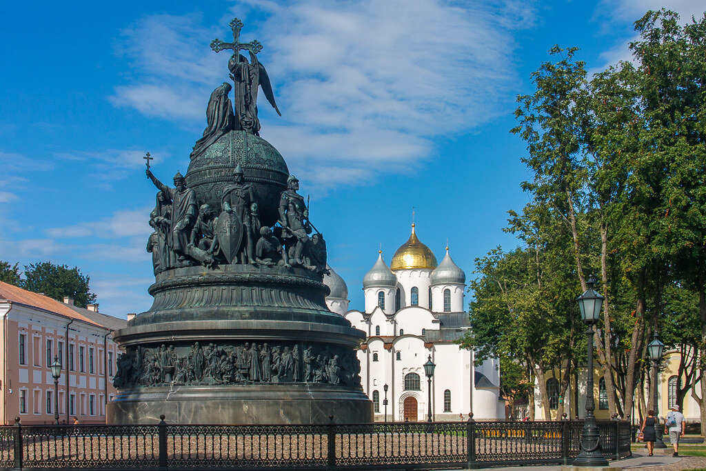 Уже больше 150 лет прошло с тех пор, как в Великом Новгороде был установлен памятник «Тысячелетие России». За это время сменилось несколько политических режимов, а вместе с ними и взгляды на историю нашей страны. Многие исторические фигуры, которые во времена Александра II были сочтены достойными увековечения, сегодня вызывают яростные споры. Велес и Перун Языческих богов скульпторы Павел Михайлов и Роберт Залеман изобразили в среднем ярусе памятника, причём неподалёку друг от друга. Фигура Велеса в лучистом кокошнике и с коровьей головой на груди грозит кулаком из-за спины князя Рюрика. Рядом под ноги Владимира Святого повержен идол Перуна. И если сцена падения Перуна символизирует отказ от язычества, то идол Велеса вызывает много вопросов. Хотя «скотий бог» считается вторым по значимости в древнеславянском пантеоне, его «возвеличивание» в православной стране выглядит более чем странным. Кроме того, сам князь Рюрик, если верить норманнской теории, поклонялся совсем другим богам. Тат