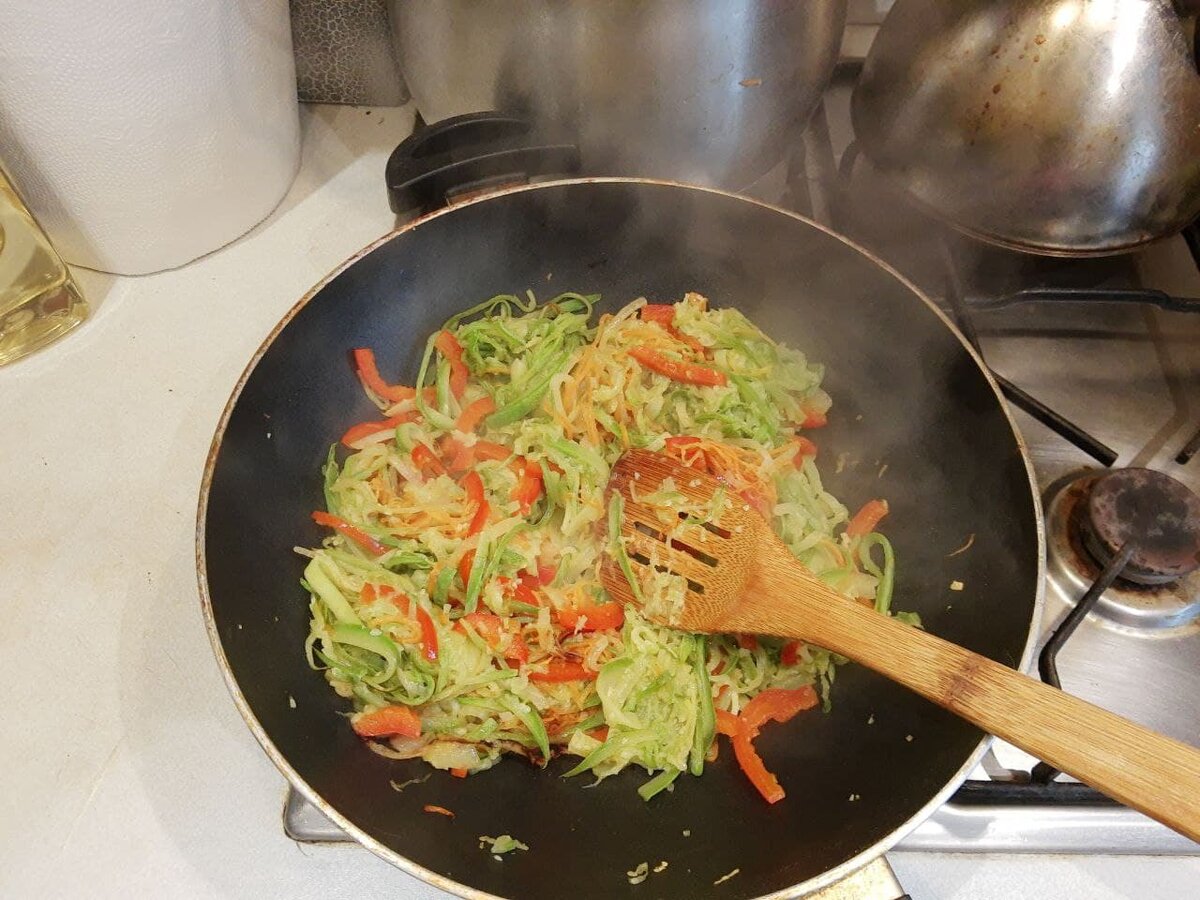 я пожарила куриные бедра (рецепт элементарный, его напишу позже). Лапша с овощами стала сложным и очень вкусным гарниром. Нам потребуется: Трем кабачок на терке для корейской моркови. Именинник подключился к столь ответственному действию. Затем муж нарезал овощи: лук - полукольцами, морковь - на той же терке, что и кабачок, перец - полосками. Заранее варим пачку лапши согласно рецепту на упаковке. Разогреваем вок-сковородку, вливаем масло, считаем до 10 и бросаем лук с морковкой. Жарим до полуготовности. Добавляем нарезанный перец, перемешиваем и прогреваем 2-3 минуты. Содержимое вока откладываем