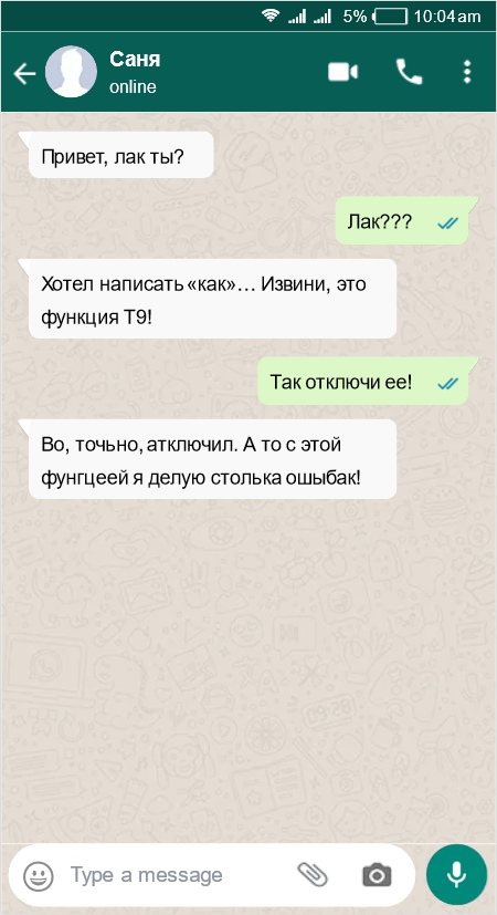 Машинный разум далеко не всегда правильно понимает наши желания, от этого его помощь может только навредить. Он портит ваши сообщения почти постоянно, но самое смешное начинается, когда вы не замечаете его помощи, пока не станет слишком поздно. Хотя некоторым эта помощь жизненно необходима Т9 как эталон решительности Вот и накрылась встреча медным тазом А были ли у вас такие казусы с автозаменой? Часто ли она мешает вам нормально общаться? Или же вы те люди которым она жизненно необходима?