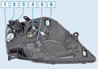Расположене ламп в блок-фаре: 1 – лампа указателя поворота; 2 – механизм регулировки света фар; 3 – винт регулировки света фары по вертикали; 4 – лампа головного света (ближний, дальний); 5 – лампа габаритного света; 6 – ручка регулировки света фары по горизонтали