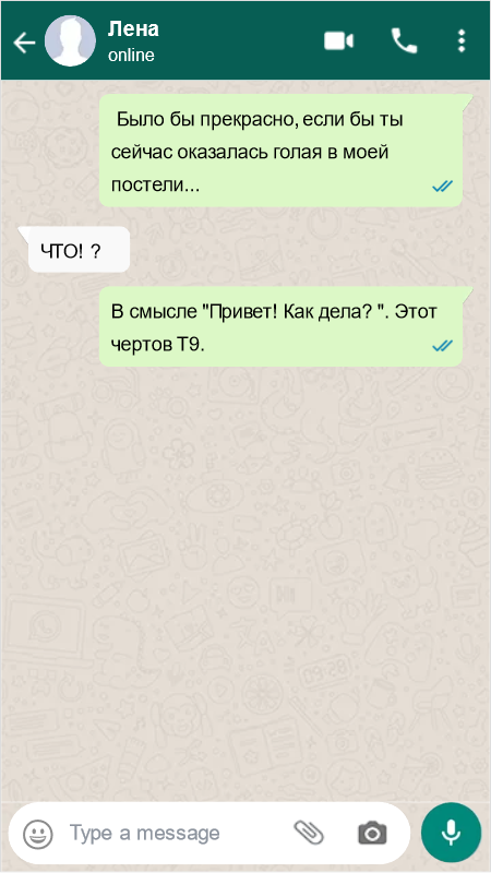 Те переписки, где Т9 мешает нам, мы уже обсудили, но кроме того автозамена может служить и универсальным оправданием. Что бы ты не написал ты всегда сможешь свалить свой косяк на т9. Не удался подкат? Виноват т9, а ты вообще не причём Паленые контакты? Т9 - лучший козёл отпущения Главное не забывать, что вы уже говорите в живую Ну и бонусом Парню явно идея от т9 понравилась Пытались ли вы объяснить свои косяки машинным разумом? Получалось ли? Или же такое объяснение не работает?
