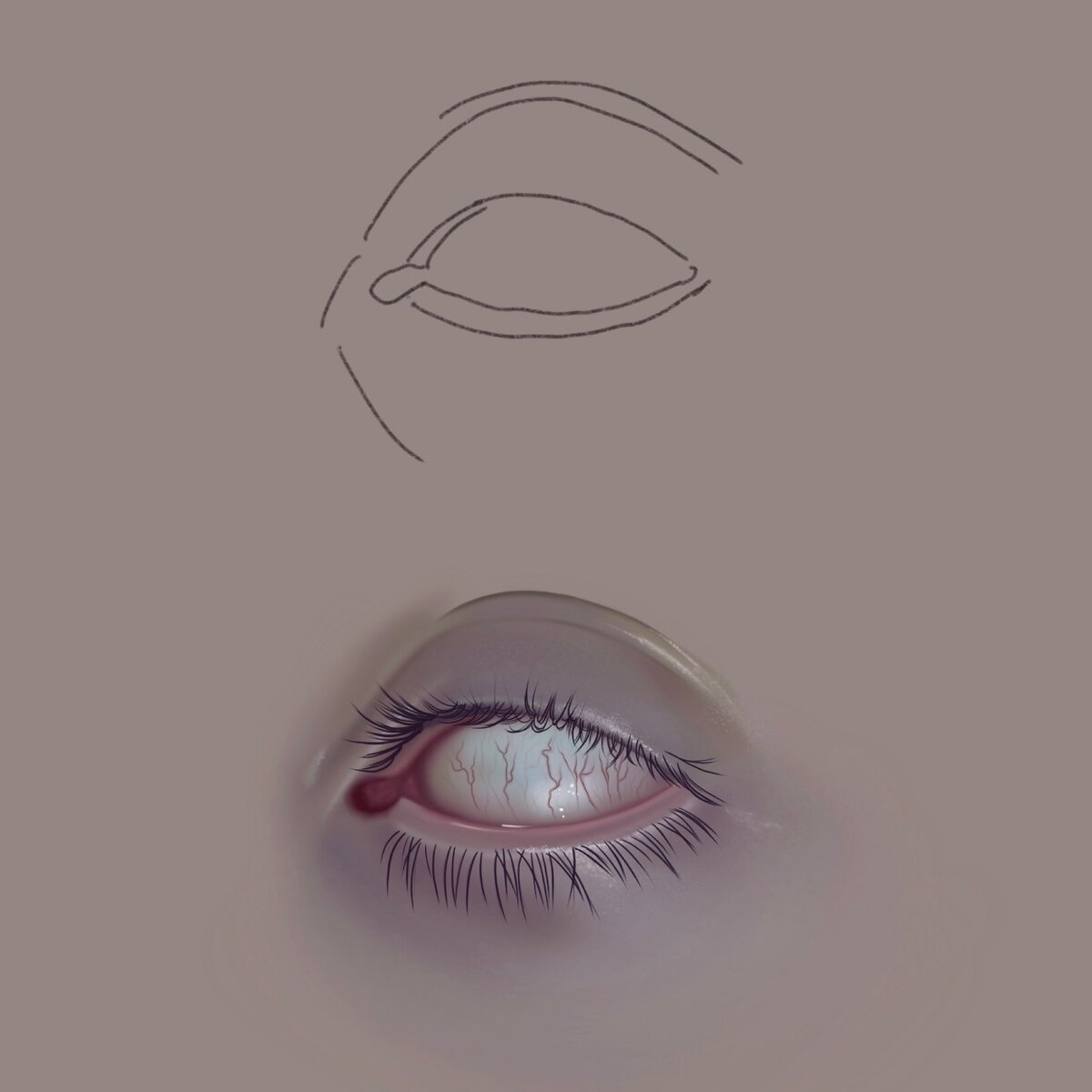3 этап. Создаём слой «2». Рисуем сосуды. 4 этап. Создаём слой «3». Аэрографом закрашиваем веко, на слой «1» добавляем блик. 5 этап. Создаём слой «4». Добавляем ресницы, создаём слой «5», рисуем блики глиттером. 6 этап. Ресницы ярче, на слой «5» добавляем бликов. 7 этап. Создаём слой «6», рисуем слизистую. 8 этап. Растушевываем слизистую и нижнее веко. Готово)