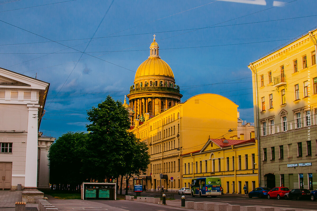Сперва мы проехались по Конногвардейскому бульвару и полюбовались на Исаакий в лучах заката