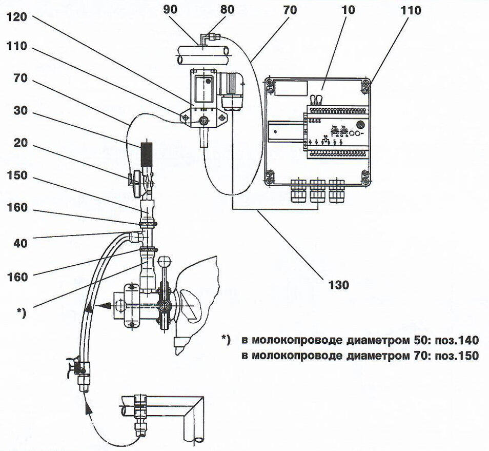 Инжектор воздуха. 10 - блок управления электронный; 20 - клапан сливной в комплекте; 30 - патрон фильтра; 40 - тройник соединительный для шланга; 70 - шланг вакуумный; 80 - угловой соединительный патрубок для шланга; 90 - сальник; 110 - комплект крепежный деталей; 120 - клапан магнитный; 130 - кабель в комплекте; 140 - муфта; 150 - шланг молочный; 160 - хомут шланговый. Блок управления электронный. Клапан сливной в комплекте. 10 - корпус клапана сливного; 20 - мембрана; 30 - крышка клапана; 40 - Кольцо резьбовое; 50 - колпачок предохранительный; 60 - шайба центрирующая; 70 - пружина коническая.