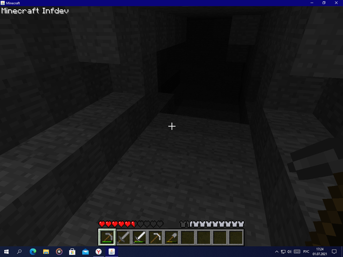 Это предпоследняя альфа-версия на сегодня. В ней опять обновили вид от 3-его лица сзади и теперь он похож на тот, что есть сейчас. В этой версии я почти не выходил на улицу и копался в шахте до тех пор, пока у меня не сломались все 4 каменные кирки. За этот поход я смог добыть 12 железной руды, много угля и несколько стаков булыжника.