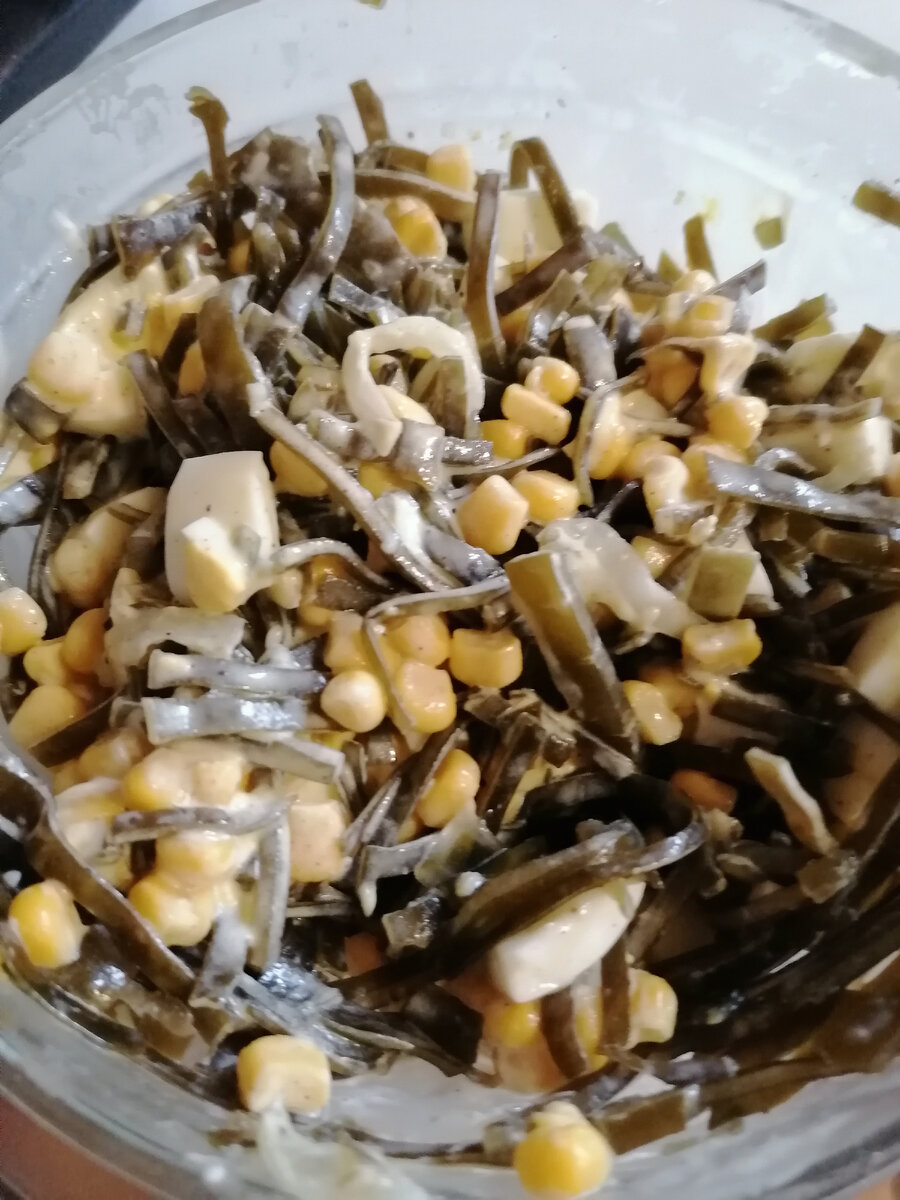 Очень вкусный салат по быстрому можно сделать из морской капусты. Морскую капусту можно взять готовую или приготовить самим, если как и мы живёте у моря и можете сами по сезону "добыть" капусту ☺️ Для приготовления супер быстрого салата нужно: Капусту режем соломкой. 🥚 Яйца отвариваем, чистим и режем кубиком. Добавляем консервированные кукурузу. 🧂 Добавляем соль и перец по вкусу. Приправляем все майонезом, перемешиваем и готово! Максимально просто. А сколько полезности в морской капусте! Будьте здоровы!