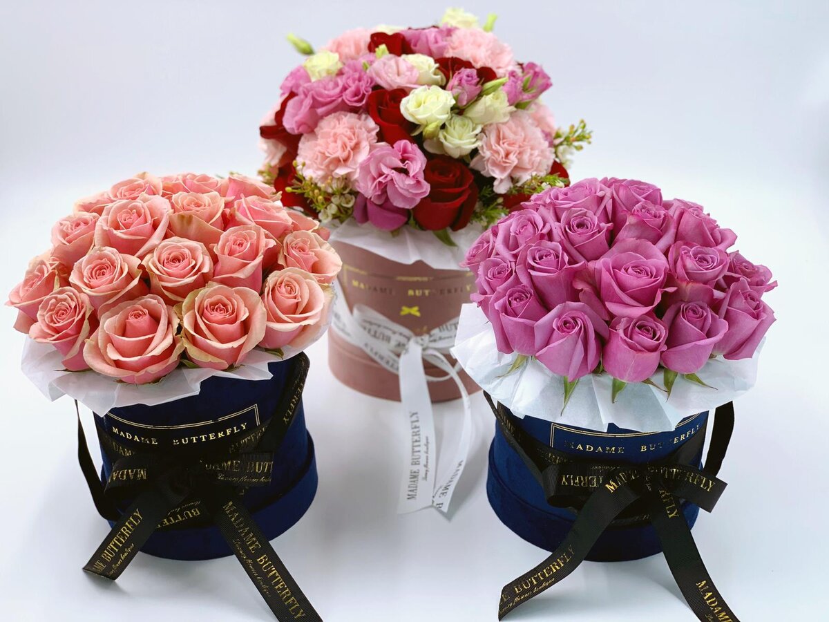 Композиция в шляпной коробке стоит гораздо дольше из-за того, что стебли находятся во флористической губке, она напитывает их влагой и в то же время не дает распространяться губительным бактериям. Розы могут стоять в прохладном помещении до 2х недель, композиция из разных цветов – 1 неделю.