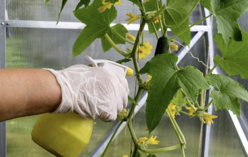 Раствор готовят в баке опрыскивателя, огурцы обрабатывают вечером, чтобы солнце не обожгло листья. Такая подкормка повышает урожайность, улучшает вкус плодов.