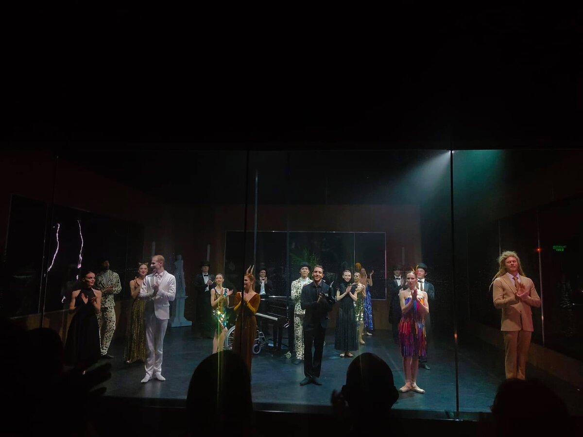 При упоминании балета с таким названием, да на одноимённого Шумана, сразу в голове всплывает Фокин, но это совсем другое, и тут два карнавала – первым идёт Сен Санса. И в нём танцуют животные, в то время как под Шумана – люди, так что параллель легко просматривается. Весьма искусно соединил Кирилл Симонов эти два произведения, да и склеил эффектно, и, хотя персонажи не повторяются, отсыл идёт. В этом, бессюжетном, по сути, балете, смысл есть, к тому же он, как и положено в этом жанре, зрелищен. И сразу необычен – действие происходит в застеклённом с двух сторон кубе, а по двум другим стенкам давались соответствующие проекции. Зрители же сидят с этих двух сторон и, так как это малый зал, очень близко. Эффект аквариума получилось создать, впрочем, артисты несколько раз выбегали из него, что добавило постановке живости. Однако и без пробегов, действие и так весьма динамично – номера чередуются в обоих «Карнавалах» в быстром темпе. Далеко не всегда они проистекают друг из друга, но срежисс