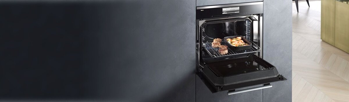 Духовые шкафы от известного бренда Миле отличаются высоким качеством, инновационностью и технологичностью. Однако модель H 7840 BM OBSW выделяется даже среди них. Разберёмся вместе, чем так хорош этот духовой шкаф? Объём небольшой, всего 38 литров. Габариты тоже весьма компактны: высота духовки — всего 45 см. При этом готовить можно сразу на трёх уровнях! Корпус выполнен из нержавеющей стали. Но загрязнения с него удалять просто: благодаря специальному покрытию CleanSteel, дверцу и панель управления можно просто протереть, чистящие средства не нужны. Прибор подключается к умному дому через Miele@home: вы можете дистанционно управлять процессом приготовления пищи. Автоматизировано всё: есть сразу 20 различных программ и возможность настройки температуры, режима и продолжительности приготовления. Задавать температуру легко и удобно благодаря сенсорному дисплею. В духовом шкафу предусмотрено несколько режимов: Опция быстрого разогрева даёт возможность готовить, экономя время: температуру