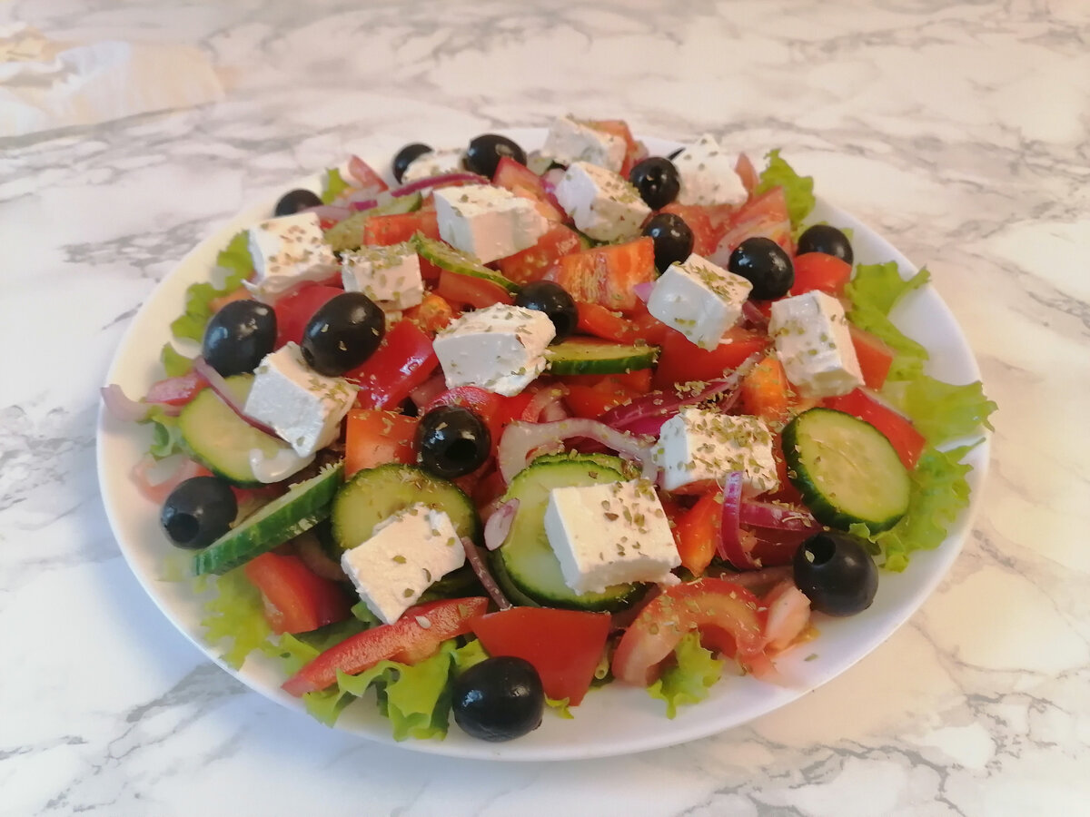 - Выкладываем сверху на салат брынзу и маслины.