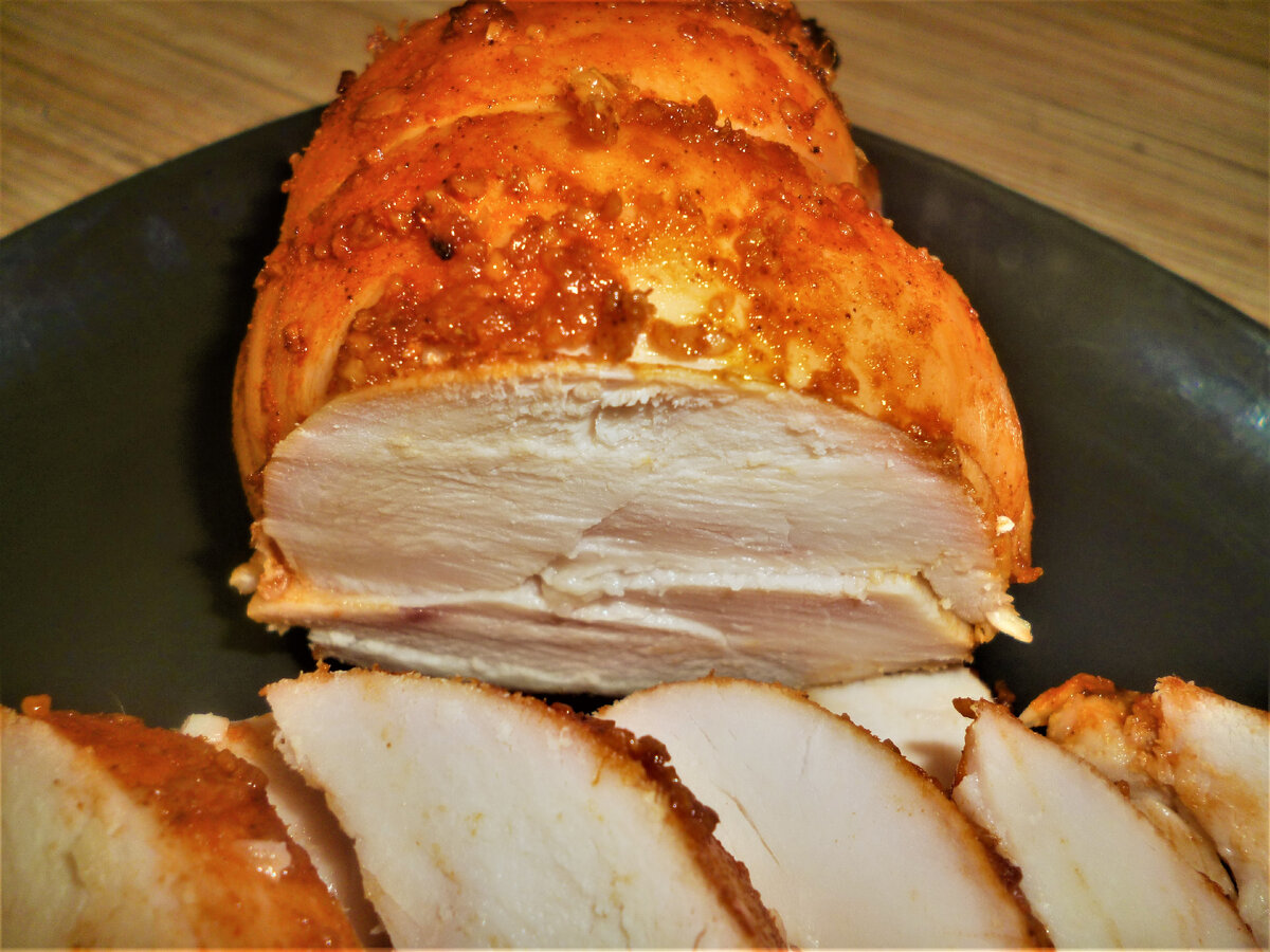 Вновь хочу предложить вам чудесный рецептик сочной и ароматной куриной грудки. Я очень люблю такие рецепты: в них - одни плюсы. Готовить - быстро, вкус изумительный, да еще и полезно, и калорий мало. Подходит как для бутербродов, так и просто с любым гарниром. Или тем, кто худеет - отличный ужин. И детишкам вместо магазинной колбаски можно предложить. Нам потребуется: Куриная грудка -около 500г Молоко - 0,5 стакана Соль 1,5-2 ч.л. Масло оливковое(или растительное) 0,5 ст. л. Соевый соус 0,5 ст. л. Мед 0,5 ч.л. Уксусная эссенция 0,5 ч.л. Паприка 1 ч.л. Чеснок сушеный 1 ч.л. Чеснок свежий 1-2 зубчика по желанию. Приготовление: Готовится такая пастрома проще простого. Куриную грудку освобождаем от шкурки и косточки. Получаются два филе. Кладем их в неширокую чашечку и заливаем молоком. В молоке предварительно нужно размешать соль до полного растворения. Молоко должно полностью скрыть мясо. Оставляем курицу в соленом молоке на 2 часа (можно дольше). Готовим соус. Смешиваем масло, соевый со