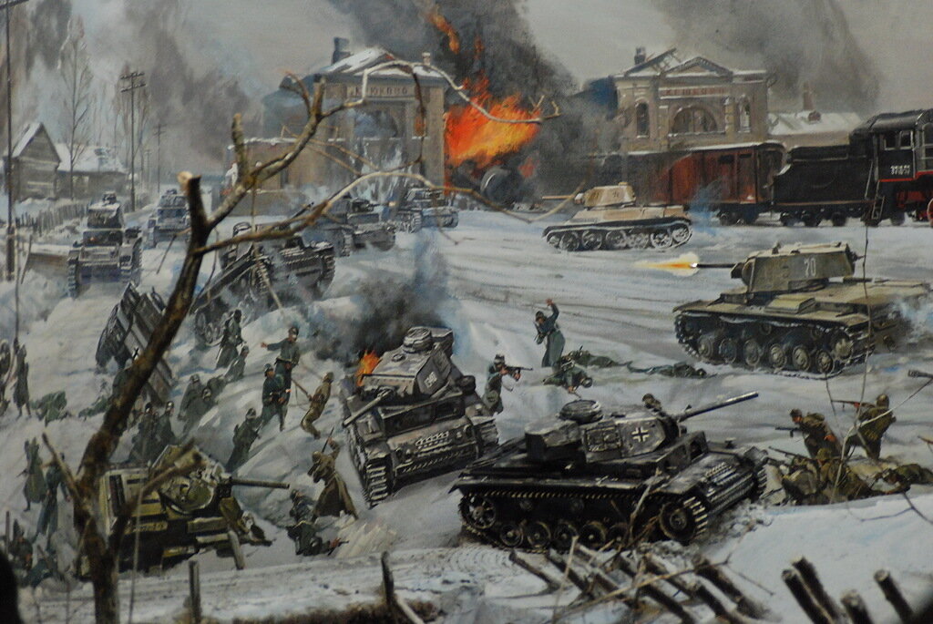 Более миллиона немецких солдат были брошены в атаку на Москву, поскольку Гитлер приказал, чтобы город был стерт с лица земли, а не захвачен. Поначалу продвижение немцев было быстрым; к 15 ноября 1941 года они с боями приблизились к городу на 17 км. Затем сопротивление советских войск замедлило их продвижение, и наступила ранняя зима. Немецкая система снабжения провалилась, и маршал Жуков бросил в контратаку резерв из сибирских дивизий. К январю немцы были отброшены. Советская армия понесла тяжелые потери, но немецкая атака была сломлена.