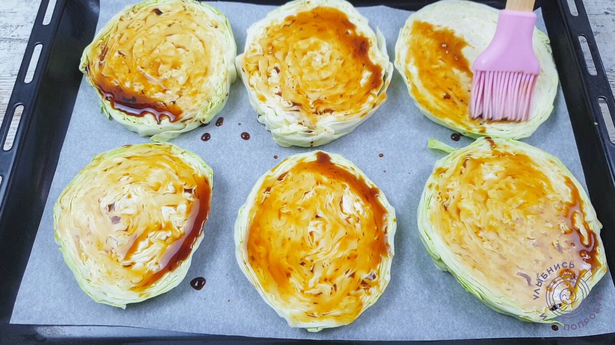 Вкусный ужин из простых продуктов, которые точно есть у вас дома. Молодая капуста и куриные бедрышки. Вкусно, просто, сытно. Как готовить: Берем 6 куриных бедер, промываем и обсушиваем. На каждом курином бедре делаем несколько надрезов. Для маринада в миске смешиваем 5 столовых ложек соевого соуса, немного соли, перец. Выдавливаем в смесь 3 зубчика чеснока. И добавляем 50 граммов растопленного сливочного масла. Заливаем маринадом курицу, хорошо перемешиваем и оставляем мариноваться на 1 час. Молодую капусту небольшого размера нарезаем на кольца шириной 1,5-2 см. Противень застилаем бумагой для выпечки и выкладываем 6 колец капусты. С помощью кисточки капусту сперва смазываем соевым соусом. Затем смазываем капусту растопленным сливочным маслом. Сверху капусты выкладываем куриные бедра. Оставшийся маринад распределяем поверх курицы. Отправляем курицу запекаться в духовку, разогретую до 180С на 1 час. Ура, готово! Приятного аппетита! Видео приготовления курицы с капустой в духовке можно п