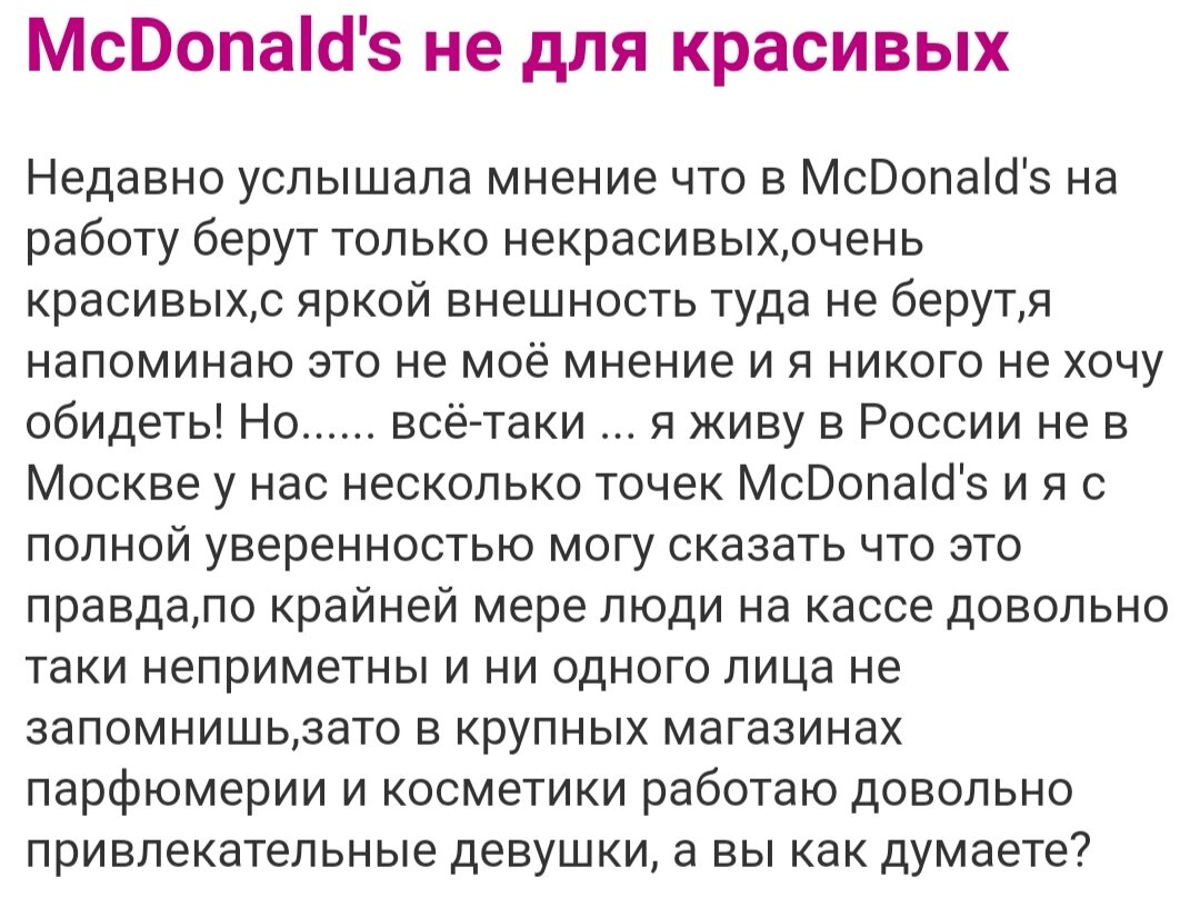 В интернете можно найти множество статей, которые занимаются разоблачением Макдоналдса. Их заголовки могут звучать как "10 страшных фактов о Макдоналдс!" или "из чего на самом деле делают картошку в Макдоналдс?!". В общем, огромное количество слухов ходит об этом заведение и некоторые довольно абсурдны. Как-то давно я наткнулась на пост, где говорилось, что на работу в эту компанию берут только людей с внешностью "сильно ниже среднего" Так ли это? Читайте ниже в статье.... Меня, как человека работающего в Макдоналдс возмутил и обидел факт, описанный выше... Думаю, никому не хочется думать, что он прошел кастинг на работу, где требуется "плохая внешность". Поэтому, я решила разобраться в вопросе. Сначала приведу несколько причин, по которому в Мак могут набирать специально некрасивых: Кому-то причины покажутся высосанными из пальца, но тем не менее они имеют право на существование. Откуда вообще появился слух о том, что на работу в Макдоналдс берут людей с "пониженным уровнем к