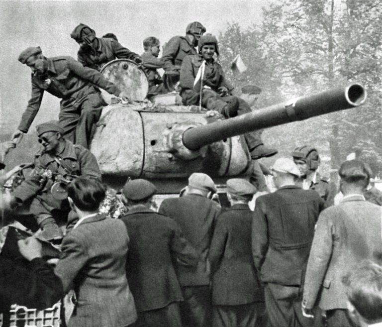 Residents of Prague meet T-34-85 from the 1 st Czechoslovak Corps on Soviet tanks.