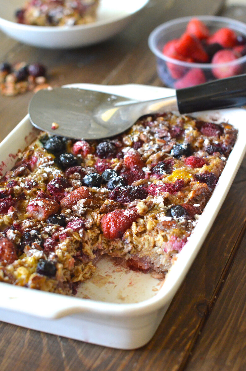 - Разогрейте духовку до 160 °C. Выложите тесто в форму для выпечки, застеленную пергаментом. Сверху распределите ягоды, слегка вдавливая, выпекайте 45 мин. Дайте немного остыть, присыпьте сахарной пудрой и подавайте.