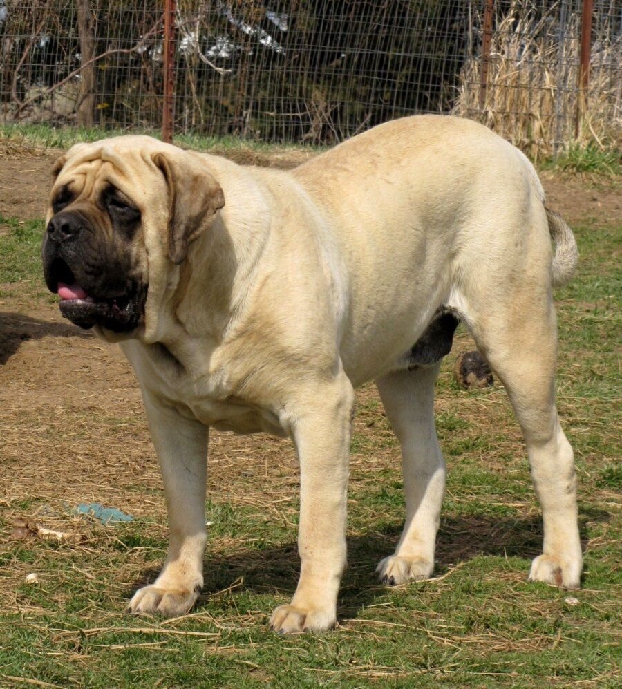 В мире существует около 400 пород собак. Это многообразие пород традиционно делится кинологами на три основные группы: мелких, средних и крупных собак. Однако, встречаются настолько крупные особи, которые выделяются специалистами в отдельную четвертую группу – «гигантские породы». Это собаки, вес которых превышает 50 кг! 1. Английский мастиф Английский мастиф относится к числу старинных английских пород догообразных собак. Он является не только самым большим в своем семействе мастифов, но и считается самой большой собакой по массе тела в мире. Средний вес этого «малыша» находится в пределах от 60 до 100 кг! Рост английского мастифа может быть от 68 до 76 см в холке. Самым выдающимся представителем этой породы является пес по кличке Айкама Зорба, рожденный в далеком 1981 году. Вес этого уникального самца составлял 155 кг, а рост – 94 см! Он был внесен в Книгу рекордов Гиннеса как самая высокая и тяжелая собака в мире. 2.Немецкий дог История этой аристократичной и столь эффектной пор