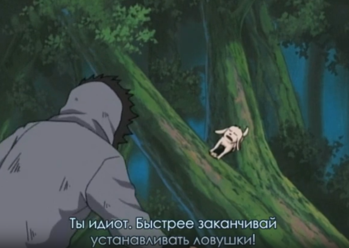 И, закономерно, Акамару запинается, падает, а Сакон ловит его леской прямо рядом с одной из печатей, что угрожает смертью пёселю.