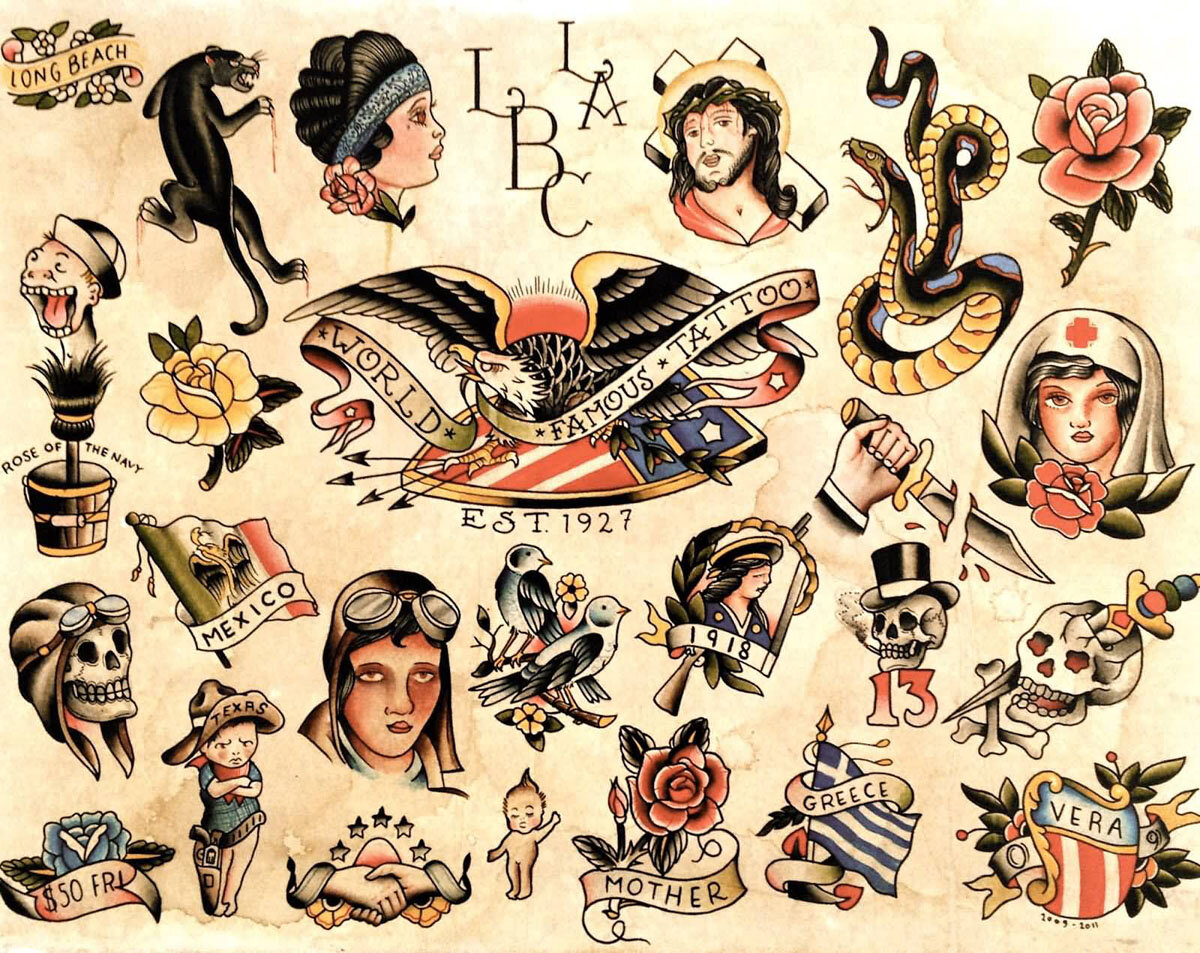 Татуировки в стиле Олд Скул стали популярными в 1920гг. Основными характерными чертами татуировок в стиле Олд Скул являются крупные и смелые образы, выполненные в сплошном цвете, имеющие жирную обводку деталей черным или синим цветом. Причиной такого внешнего вида послужили методы, используемые для создания татуировки в те времена, когда она зародилась, и они очень отличаются от тех, которые используют сегодня. Поскольку качество машинок и чернил были не очень хороши, рисунки были простыми и набивались на совесть, чтобы они носились хорошо в течение долгого времени. Другая причиной того что татуировки были простыми, является непрофессионализм художников, которые их били, следовательно рисовать простые картинки было большей гарантией хорошего итогового результата. Третьей причиной простоты изображений - были трафареты. Перед тем как эскиз тату вырезали, ацетат и порошкообразный уголь втирали в травления перед нанесением на кожу. Древесный уголь очень быстро смазывается