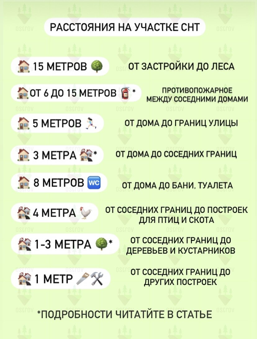 Далеко не все садоводы-новички знают, что существуют специальные требования по строительству на садовых участках. Причём под разные категории - разные правила. Начнём с СНТ, но обязательно расскажем об остальных по порядку. Казалось бы, своя земля - в прямом смысле «поле для фантазии», но существует документ, который ее ограничивает - свод правил СП 53.13330.2011 для участков размером 5-6 соток. Если участок меньше, то уменьшаются и нормативы. А теперь пройдёмся по основным требованиям: Это только основные требования по минимальному расстоянию между объектами, а есть ещё: нормы СанПина, нюансы по высоте забора, и многое другое чем мы будем делиться. А если у вас остались вопросы по правилам застройки, задавайте их в комментариях. Также мы рассказываем о правовых нюансах загородной жизни в нашем аккаунте. Будем рады новым гостям!