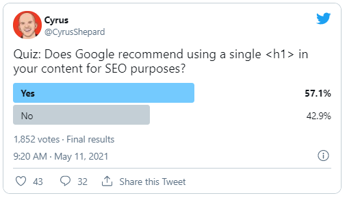57% вебмастеров не знают рекомендаций Google по тегам H1 Известный западный SEO-эксперт Сайрус Шепард опубликовал опрос в Twitter, чтобы выяснить, знакомы ли специалисты отрасли с рекомендациями Google в отношении тегов H1. В опросе приняли участие почти 2000 человек. 57% из них считают, что Google советует использовать только один заголовок H1 на странице. Что касается официальных рекомендаций Google, то они другие. Так, в июне 2020 года Джон Мюллер заявил, что с точки зрения Google, заголовки H1 полезны, но не критичны. Поэтому страницы будут ранжироваться и без них. В августе он добавил, что теги заголовка – это сильный сигнал. Поскольку заявление о том, что теги H1 не являются обязательными, вызвало активную полемику в SEO-сообществе, Google опубликовал отдельное справочное видео, посвященное этому вопросу. В нем Мюллер еще раз повторил, что для поисковой системы заголовки H1 не имеют значения. Сколько таких заголовков на странице – один, несколько или ни одного – неважно, Google в