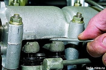 Для оценки состояния гидроопоры вставляем отвертку между кромкой корпуса подшипников распределительного вала и рычагом привода клапана.