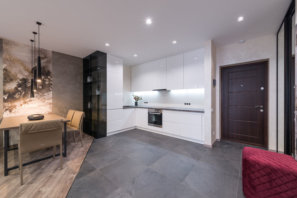 Угловые модели кухонь заслуженно пользуются популярностью и очень часто встречаются в интерьерах. А вот кухни, огибающие угол – более редкий вариант оформления пространства. Как правило, такие гарнитуры уместны в больших помещениях. Например, на кухнях-гостиных или в квартирах студиях. Рассмотрим пару примеров кухонь, где угол рассматривается не как препятствие, а как дополнительная возможность организации мест хранения. Кухни углом лишний раз подчеркивают отсутствие барьеров и свободу пространства. Кухня, заходящая за угол шкафом В дизайне кухни задействованы три основных цвета. Солирует нейтральная серая эмаль, к которой добавлены два контрастных материала: темный камень (столешница и фартук) и теплая древесная фактуру дуба на трех фасадах над рабочей зоной. Кухня углом выглядит целостно за счет того, что ее продолжили в сторону гостиной, сохранив единый цвет фасадов для обеих зон. За угол вынесен пенал для духового шкафа и СВЧ, бутылочницы разного размера. Этот угол не единственный