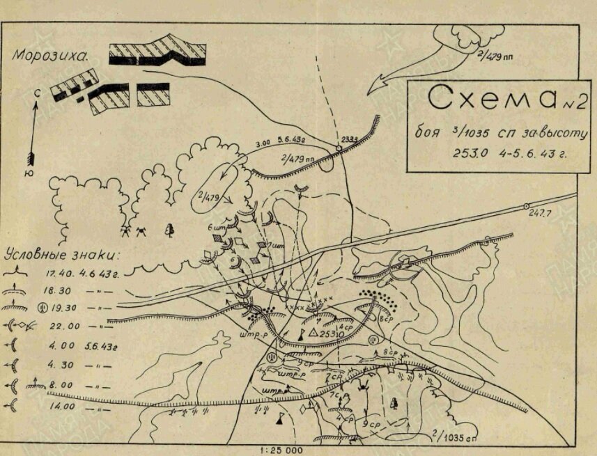 Разобравшись с тонкостями подготовки к "коллективному самоубийству", мы с полным правом можем приступить к самому интересному. Нас ждет штурм безымянной высоты. Момент истины настал 4 июня 1943 года выдалось по-летнему теплым и ясным. Назначенная для атаки группировка советских войск приготовилась к решительному броску вперед. Затемно пехота успела занять позиции и окопаться. каждый боец обзавелся собственной щелью, которую он маскировал от воздушного наблюдения. Еще ночью отличились саперы. Они смогли в 6 местах заложить взрывчатку под проволочными заграждениями. После этого саперы затаились в 150 метрах от своих зарядов, ожидая команды на подрыв. К месту предстоящего боя стали подтягиваться танки. Их прикрывали как могли. Пускали строго по одиночке разными маршрутами в разное время. Но немецкую авиацию опасались не зря. 7 танков немцы засекли с воздуха на стоянке возле Турейки. После этого на высоту 253,0 отправилось дополнительно 6 противотанковых орудий с расчетами. К сожалению,