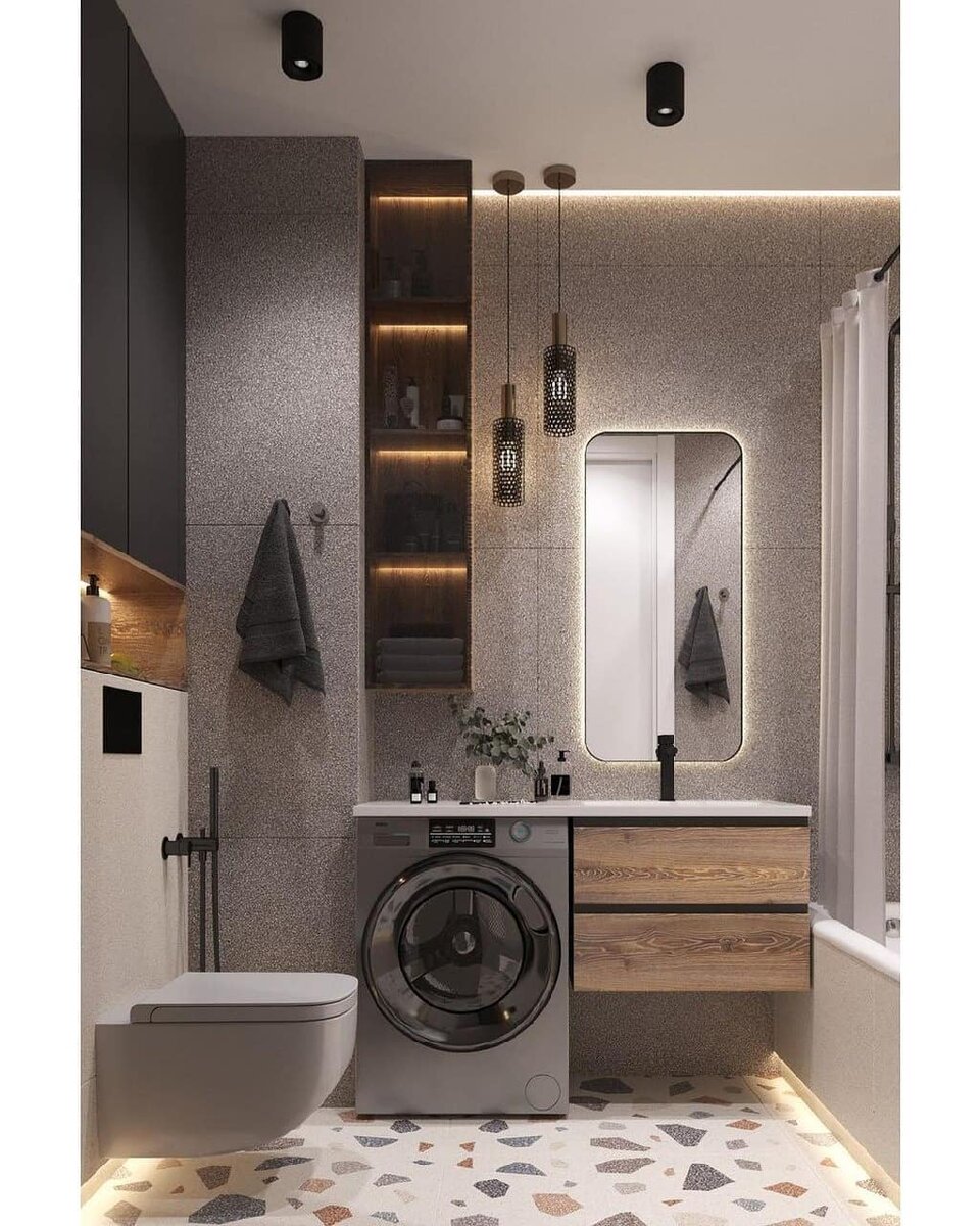 С годами все больше разнообразия появляется в отделочных материалах, что остановить свой выбор на чём-то конкретном становится всё сложнее, особенно, когда нет представления о том, как всё должно выглядеть в итоге. Для этого и создан этот канал, чтобы помогать с идеями дизайна. С первого взгляда может показаться, что этот дизайн ванный комнаты для брутального мужчины, но и многие девушки предпочитают темные тона. Дизайн ванной комнаты выполнен в "парящем" стиле. Начиная от мойдодыра с чашей унитаза и заканчивая парящими плинтусами с подсветкой. Чтобы не отличаться от общего стиля, краны выполнены в черном исполнении. Над инсталляцией реализован шкаa для хранения. Чтобы максимально использовать пространство в ванной комнате, было решено установить стиральную машинку именно здесь и сделать её открытой, а не встраиваемой. Одна из изюменок - это акцентная стена, которая выполнена из той же плитки, что и на полу. Данное решение довольно таки интересно смотрится в общей картине ванной комна