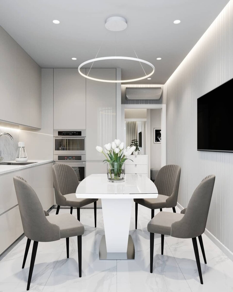 Удивительная удобная кухня на небольшой площади это не фантазия, а реальность. Поскольку площадь кухни совсем небольшая и выполнена в прямоугольной форме, было принято решение максимально оптически увеличить кухню, а это значит сделать её максимально светлой. Фасады выполнены с покрытием из белой глазури с врезными ручками. Столешница сделана из белого искусственного камня. Кухонный фартук и пол выполнены из одинаковой по стилистике плитки под мрамор, с красивыми серыми разрезами. Чтобы придать лёгкости дизайну, потолочный светильник подвешен на тонкие нити и выполнен в виде легкого круга с лед подсветкой. Вместо межкомнатной двери сделали красивую арку на кухню. Белый стол с центральной ножкой, которая сужается к полу, придаёт дополнительные вертикальные линии дизайну, которые увеличивают пространство. Стена напротив кухонного гарнитура ничем не нагружена, кроме телевизора. Если Вы не любитель телевизора, то можно сменить его на красивую картину. Ну яркой точкой на кухне являются стул